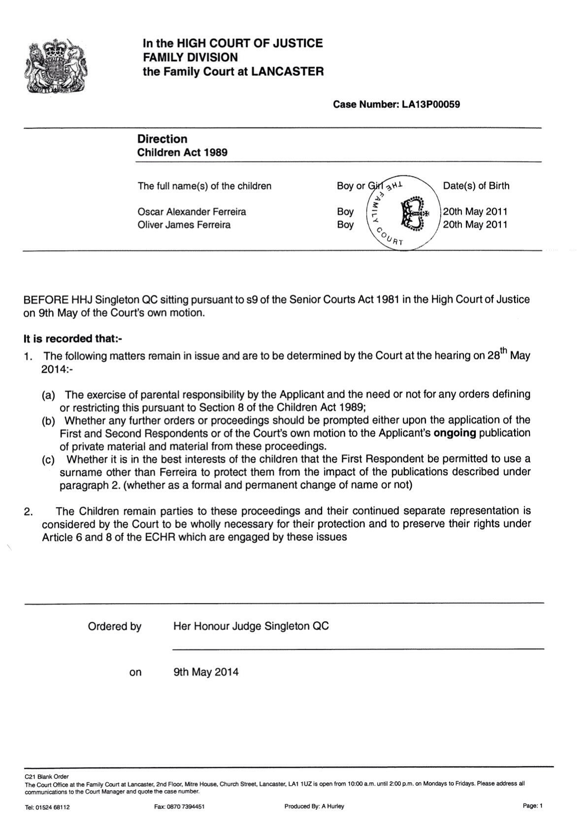 Now what I find amusing here is that in 14 months the Court have ignored each and every parental responsibility I have but now Judge Singleton wants to make an order to protect the alcoholic drug addicted paid surrogates parental responsibility , just one more example of how bias and unprofessional Judge Singleton and the High Court Family Division in the UK is in fact