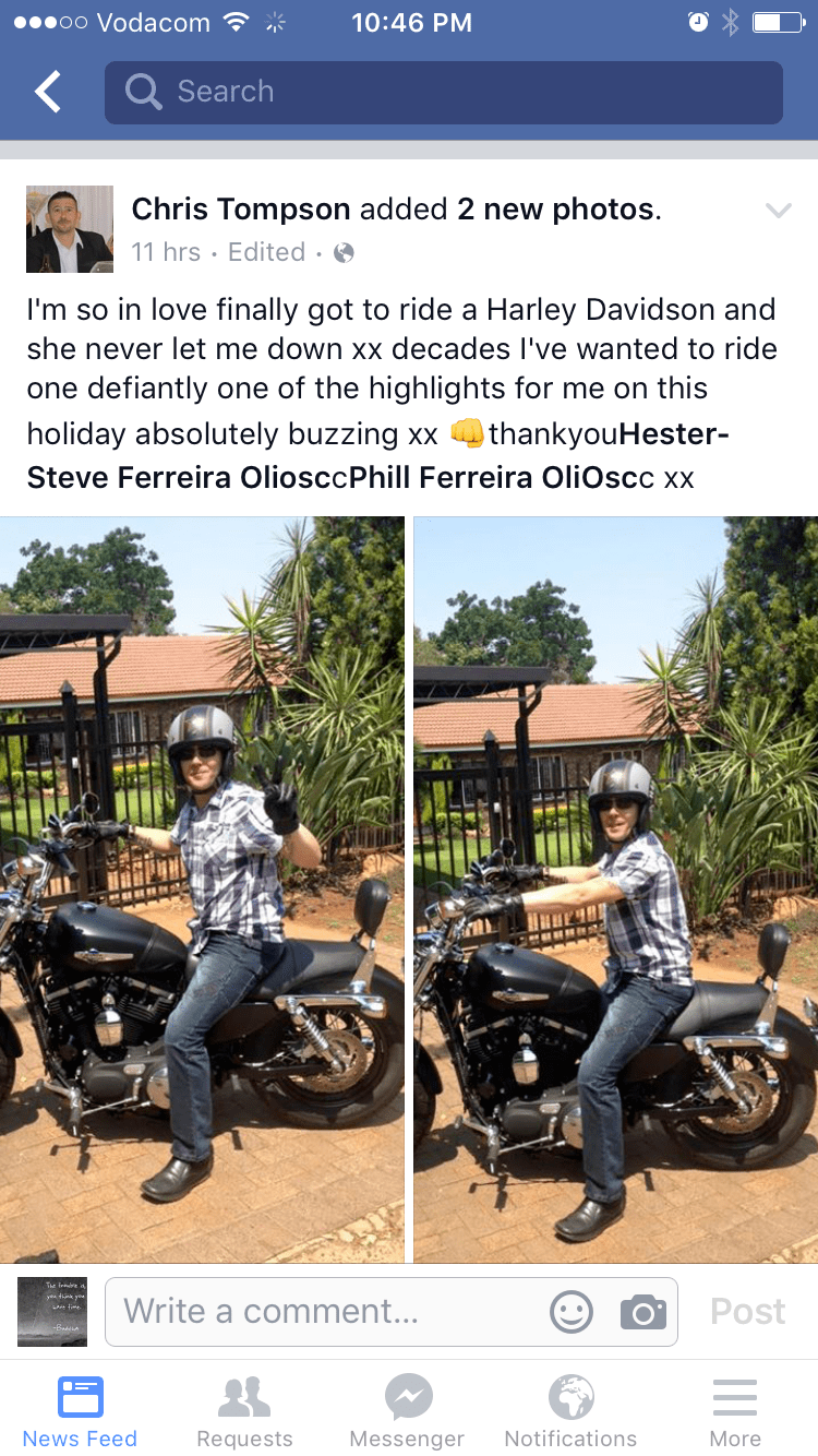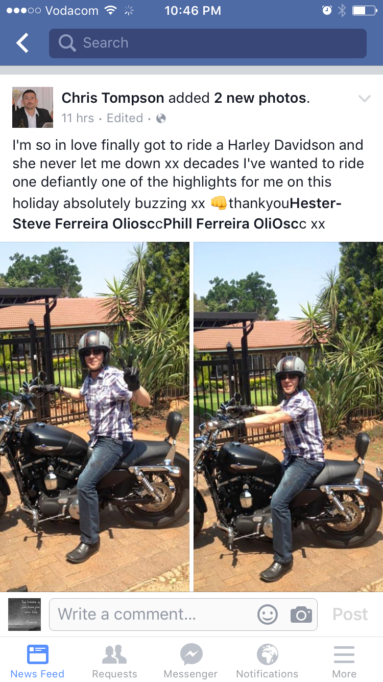 Uncle Chris having a day on Oupa’s Harley xoxo ps and a lite snack at dinner time 😀